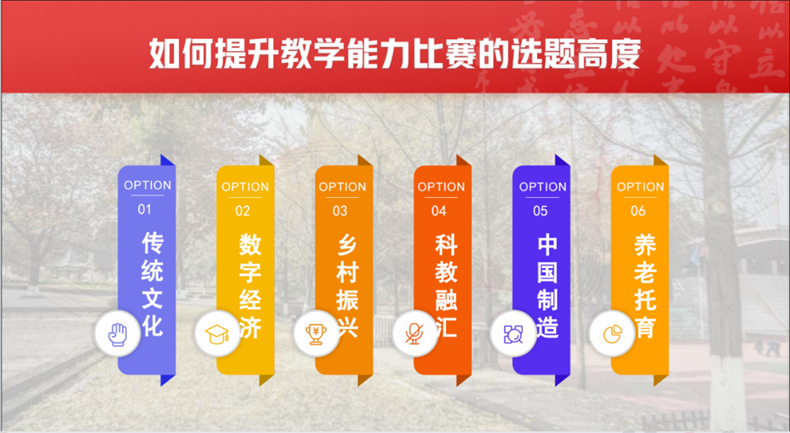 “習總書記提出,思政課是落實立德樹人的關鍵課程,思政課的本質是講道理,要將道理講深、講透、講活,老師要用心教,學生要用心悟。”袁學兵認為,教學能力比賽要對標重要論述,在整個教學能力比賽或者教學革命過程中,須了解總書記關于職業教育、各行各業的論述,以提升教學能力比賽的選題高度。除此之外,教學能力比賽還要對標政策文件要求與大賽方案文件,以提升選題的融合度,提高大賽的水平。