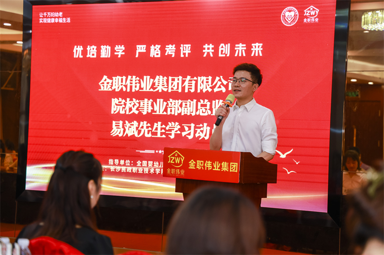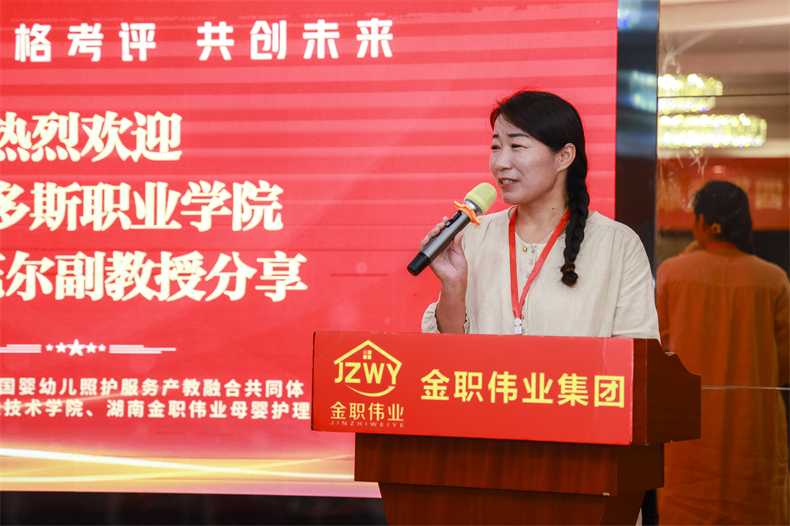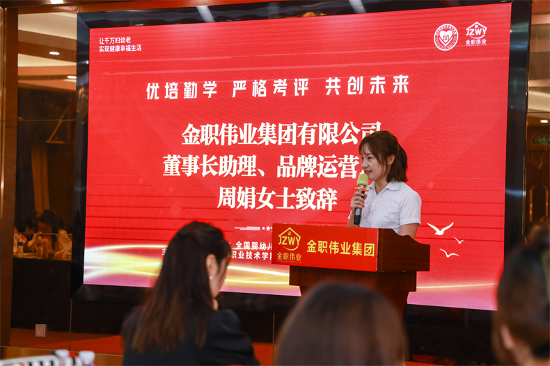 開班典禮伊始,金職偉業董事長助理兼品牌運營總監周娟以“緊跟職教好政策,深耕內涵建設”“積極構建產教融合共同體”“深化崗課賽證、產教融合,共育百萬托育人才”為主題,分享了金職偉業在推進1+X證書制度試點工作開展、深化校企合作、賦能幼兒照護行業發展等方面的舉措與成果。“今年,金職偉業將在全國多地舉行幼兒照護主題論壇,與各地校企,行業專家深入交流,促進校企人才共育,也希望在座的各位專家老師積極參與,共同推動幼兒照護行業高質量發展。”