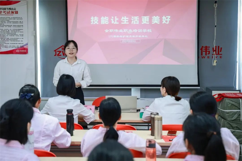 9月9日,金職偉業(yè)第576期養(yǎng)老護(hù)理員班正式開班。金職偉業(yè)招生招商事業(yè)部副總監(jiān)涂霞出席開班典禮并講話,全體學(xué)員和教師共同參與。