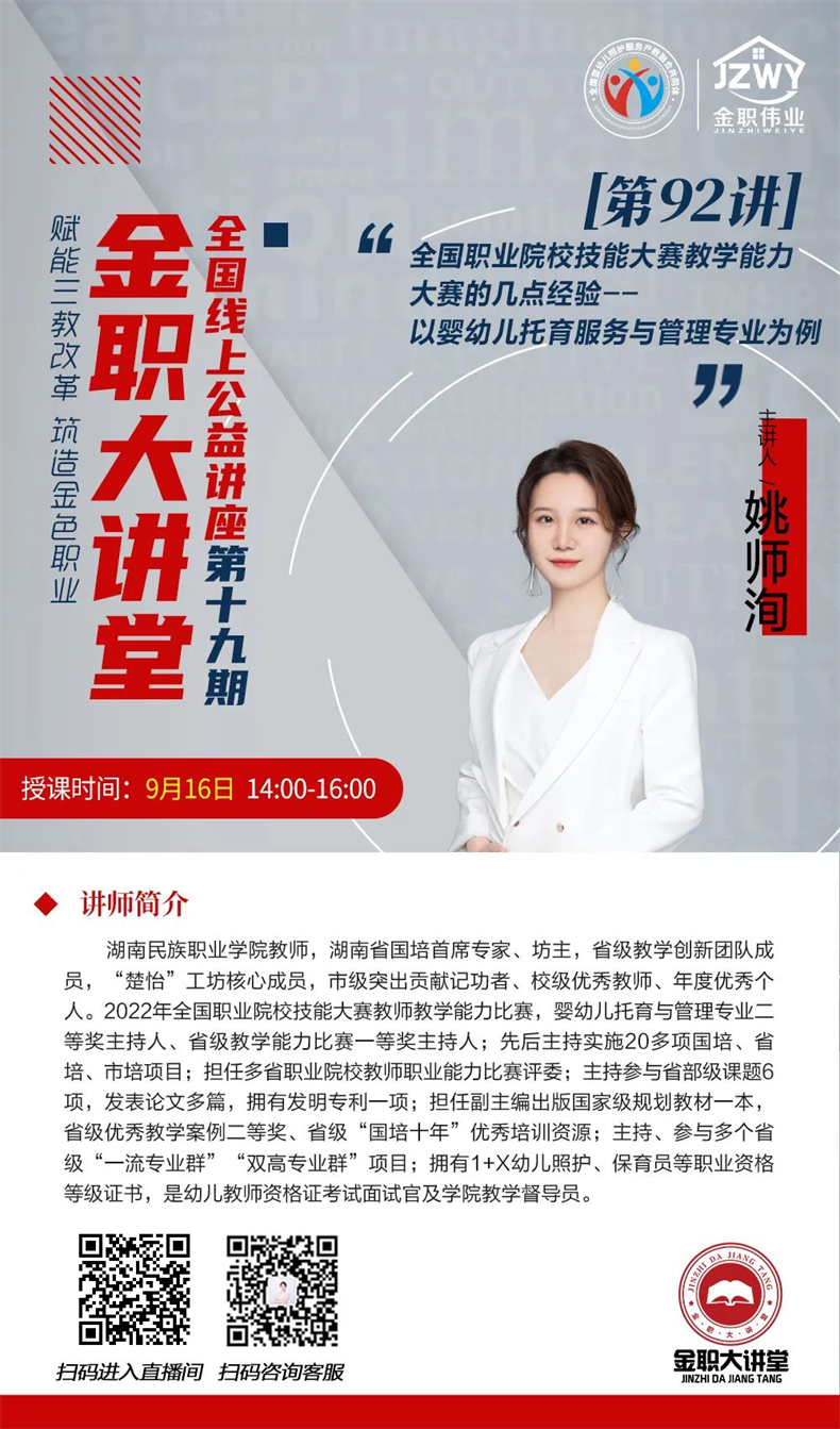 9月16日,金職大講堂將開啟第十九期第92講,課程將邀請湖南民族職業(yè)學(xué)院教師姚師洵,進(jìn)行《全國職業(yè)院校技能大賽教學(xué)能力大賽的幾點(diǎn)經(jīng)驗(yàn)——以嬰幼兒托育服務(wù)與管理專業(yè)為例》主題授課。屆時,誠邀各位行業(yè)專家、院校老師共同參與。