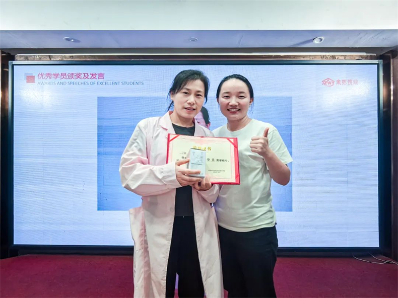 典禮上,周玉芬、丁潔獲評“優秀學員”,班主任王錫芳為她們頒發榮譽證書。周玉芬分享了自己的學習感受,她談到,此次培訓,學習氛圍濃厚,理論與技能知識專業,收獲頗豐。隨后,其他學員紛紛上臺發言,對金職偉業老師的精心授課表示感謝,她們談到,很幸運選擇了金職偉業這個培訓平臺,此次培訓,不僅豐富了自身知識,還增長了更多養育嬰幼兒的技能,進一步拓寬了自己的就業道路。