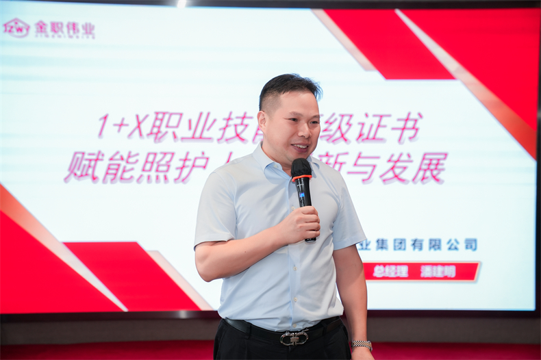 結業典禮最后,金職偉業總經理潘建明以“1+X職業技能等級證書賦能照護人才創新與發展”為主題作分享,他簡要介紹了金職偉業圍繞教育部現代職業教育體系建設改革重點任務,在深化“崗課賽證”融通等方面所做的探索與努力。“金職偉業愿與各試點院校在產教融合共同體打造、產教融合實踐中心建設、教學資源庫建設、虛擬仿真實訓基地建設、核心課程打造、教材資源開發、教師企業實踐項目開展等方面深入合作,為人才培養工作提質與職業教育高質量發展做出新的貢獻。”