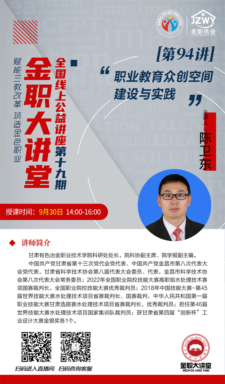 9月30日,金職大講堂將開啟第十九期第94講,課程將邀請甘肅有色冶金職業技術學院陳衛東教授,進行《職業教育眾創空間建設與實踐》主題授課。屆時,誠邀各位行業專家、院校老師共同參與。