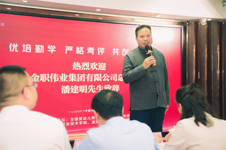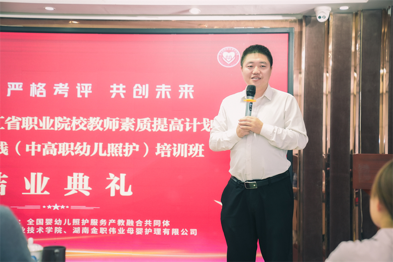 結業典禮上,金職偉業總經理潘建明對一直以來大力支持金職偉業各項工作開展的院校及托育機構表示感謝,他提到,金職偉業始終立足“崗課賽證”融通,致力于以標準認證、教材編寫、大賽舉辦等切實之舉賦能人才培養。“金職偉業也期待與黑龍江各院校的合作越走越深,各位參訓教師也能參與到教師企業實踐項目中來,將1+X幼兒照護證書標準納入人才培養體系,將企業實踐經驗融入課程教學,培養更多高素質嬰幼兒照護技能人才。”