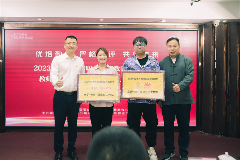 值得一提的是,為賦能教師企業實踐項目高質量開展,結業典禮現場,金職偉業特授予長沙市壹號貝貝&福小貝托育早教中心“全國職業教育教師企業實踐基地金職偉業-工作站”牌匾,并聘請一二三教育科技有限公司負責人歐陽香園長,長沙市壹號貝貝&福小貝托育早教中心負責人肖梁雅蘭園長、謝達園長為金職偉業全國教師企業實踐基地產業導師,以推進雙方資源共享、優勢互補,共同助力職業院校“雙師型”教師隊伍建設。