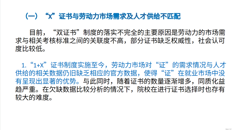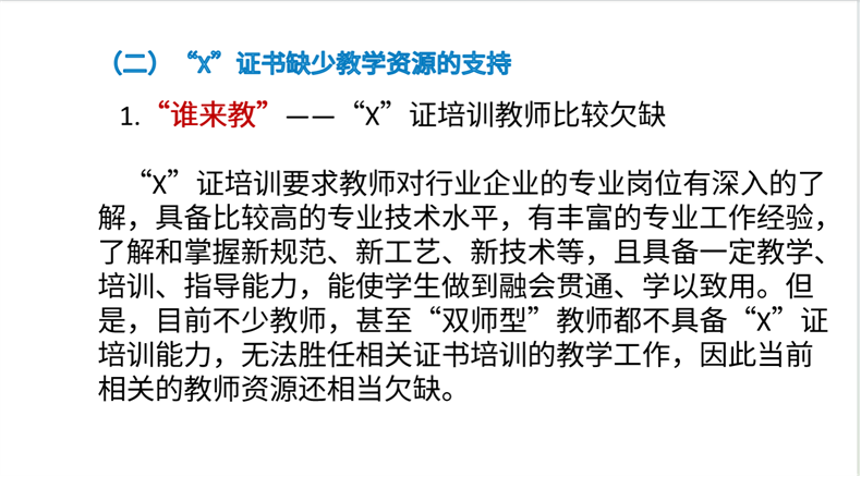 就當下“崗課賽證”與"1+X”證書制度融通發(fā)展,張平芳認為,兩者之間的融通還存在一定困境,首先,“X”證書與勞動力市場需求及人才供給存在不匹配的問題,勞動力市場對“證”的需求情況與人才供給的相關數(shù)據(jù)仍缺乏相應的官方數(shù)據(jù),使得“證”在就業(yè)市場中沒有呈現(xiàn)出顯著的優(yōu)勢。其次,一些培訓機構制定的規(guī)范欠缺公信力,相關的龍頭企業(yè)參與證書開發(fā)的力度不足也使得開發(fā)出的“X”證書受到質(zhì)疑;另外,“X”證書還缺少教學資源的支持,存在教師資源匱乏,培訓內(nèi)容不完善,培訓方式有待提高等問題。