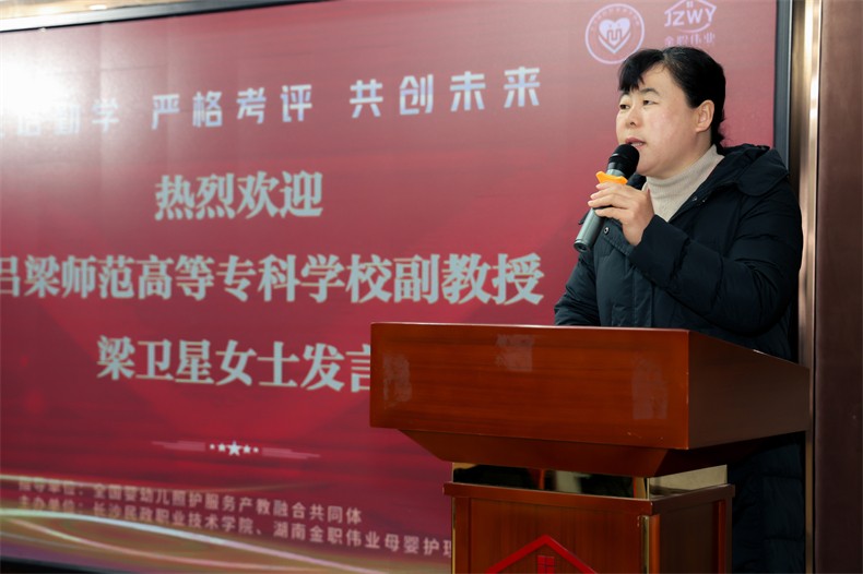 隨后,呂梁師范高等專科學校梁衛星副教授代表全體學員表示,“為切實完成培訓任務,我們將努力做到:一、珍惜機會,勤奮學習,善于思考,按要求完成培訓任務;二、相互交流,共同提高,互相配合,營造濃厚的學習氛圍;三、自覺遵守各項學習紀律和規定,服從各項安排;四、學用結合,學以致用,通過這次培訓學習,把學到的知識與技能運用到教學實踐和考務指導工作當中,提高教學考學質量。”她期望各位老師以此次培訓為起點,全面提升1+X幼兒照護證書相關的技能和水平,助推1+X證書制度試點工作。
