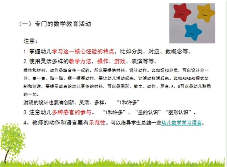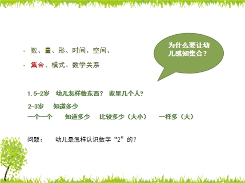 幼兒數學學習的內容包括數、量、形、時間、空間、集合、模式、數學關系的知識。史月杰詳細講解了幼兒學習集合的內容及意義。她談到,集合是現實世界的一種存在形式,幼兒要認識世界,就必須要認識集合、感知集合,讓幼兒發現事物的共同屬性,培養其對事物進行抽象理解及概括的能力;同時,集合是數概念產生的基礎,是比較數的基礎,有助于幫助幼兒理解數的組成和加減運算。