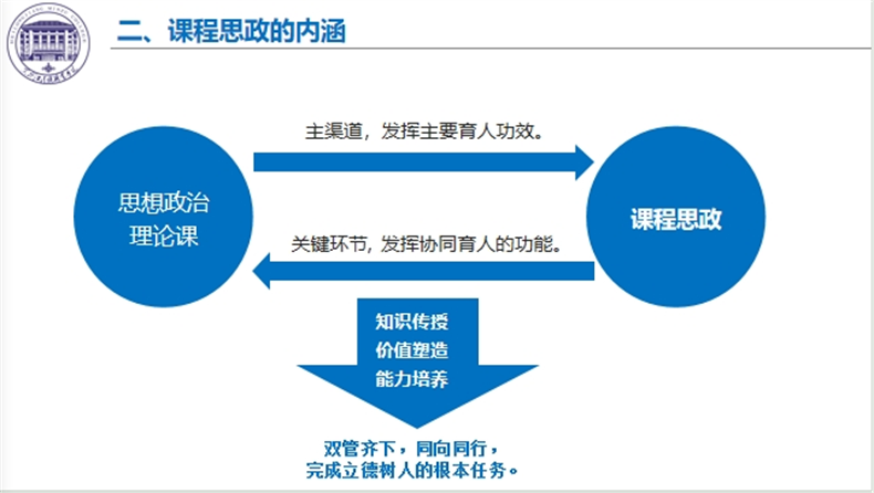 課上,徐青為我們厘清了課程思政的內涵。課程思政即將思想政治理論知識、價值觀念和精神追求等融入到高等教育的各專業、課程中去,推動思想政治理論課與課程思政同向同行,實現“知識傳授、價值塑造、能力培養”多元統一,共同擔負好育人職責,落實立德樹人根本任務。“教師要以為學生傳道授業解惑為本心,傳授學生知識,塑造學生品格,成為有利于學生成長的大先生、大老師。”