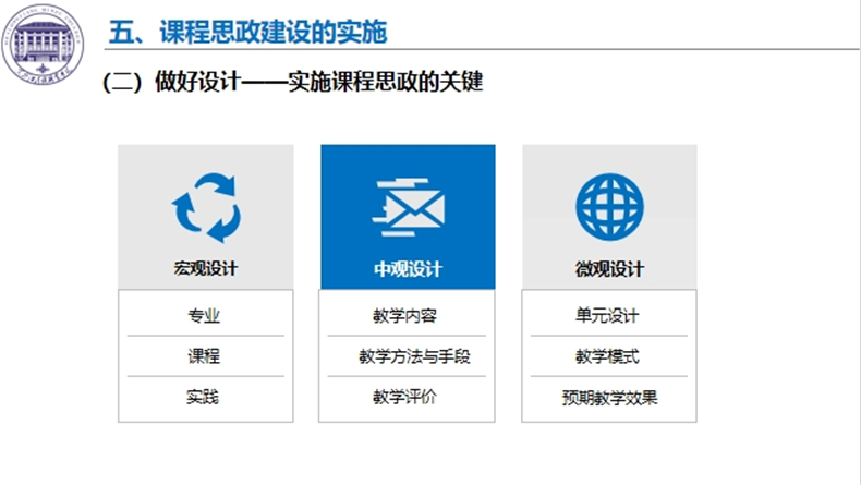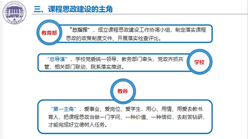 在課程思政建設的過程中,教育部、學校、教師分別扮演著“總指揮”、“總導演、“第一主角”的角色。教育部組織成立課程思政建設工作協調小組,統籌指導、部署落實課程思政建設工作;學校黨委統一領導,教務部門牽頭,黨政齊抓共管,相關部門聯動,院系落實推進;教師是教學工作的一線組織者和實施者,充分發掘和強化各類課程的育人功能,切實提高人才培養質量,發揮好主力軍作用。