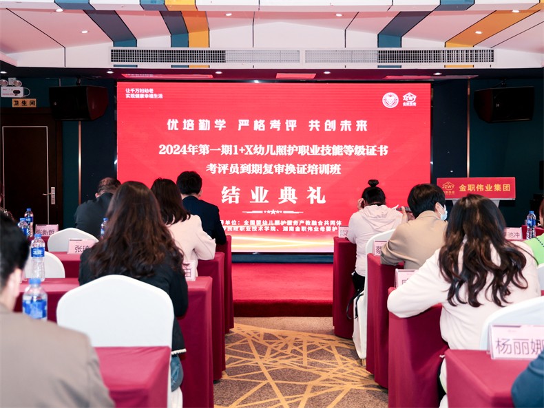 3月25日,2024年首期1+X幼兒照護職業技能等級證書考評員到期復審換證培訓班圓滿結業。金職偉業集團有限公司院校事業部副總監易斌出席結業典禮并講話。