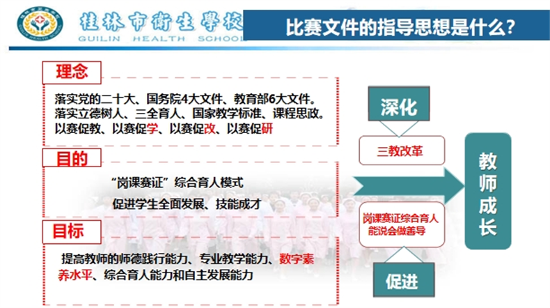 陳小博首先介紹了全國職業院校技能大賽教學能力的目的與目標。“大賽緊緊圍繞著‘崗課賽證’綜合育人、培養‘雙師型’教師展開,目的是為提高教師的師德踐行能力、專業教學能力、數字素養水平、綜合育人能力和自主發展能力,推動“崗課賽證”綜合育人,促進學生全面發展、技能成才。”