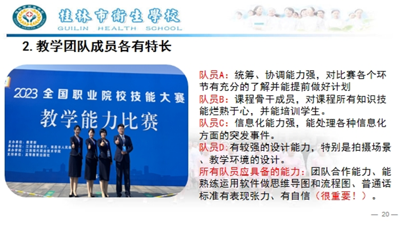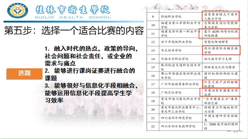 隨后,她詳細介紹了備賽的流程與步驟要點。在賽事團隊組建方面,成員之間要要優勢互補,各取所長,發揮團隊合作的最大效度;在課程選擇方面,從成員擅長的課程中選擇更貼合賽事要求的課程;在比賽選題方面,選擇便于融入時代熱點、課崗證賽、信息化手段的課題與內容;觀看歷年獲獎視頻,吸取經驗,少走彎路,反復嘗試求創新。