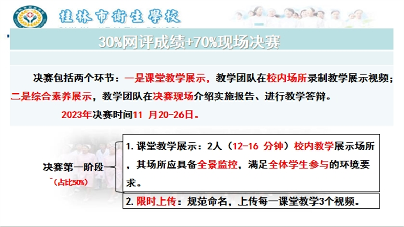 決賽包括兩個環節。一是課堂教學展示,教學團隊在校內場所錄制教學展示視頻;二是綜合素養展示,教學團隊在決賽現場介紹實施報告的主要內容、創新特色,并進行教學答辯。“廣泛搜集評委現場提問的素材,準備足夠的佐證材料及PPT展示內容,確保答辯現場能夠清晰準確地表達,展現出最好的效果。”課程最后,陳小博給出了她對參賽團隊參加答辯環節的建議。