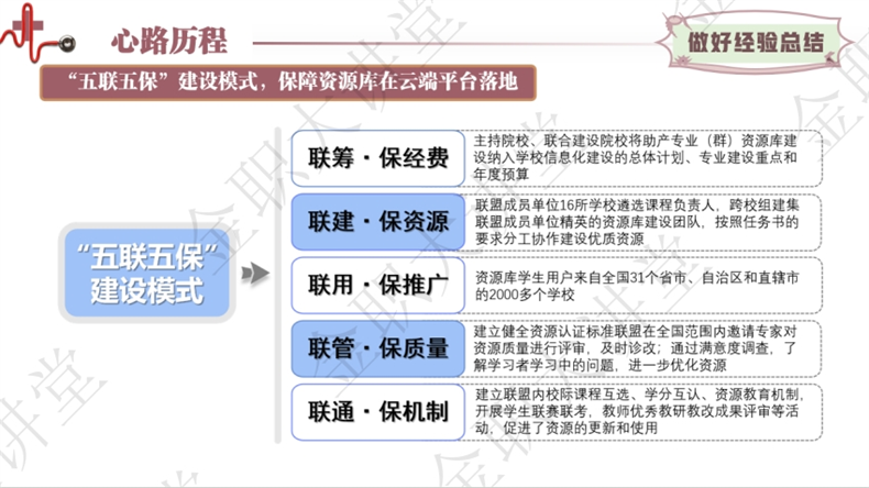 邱志軍分享了資源庫建設的經驗。學校在資源庫建設中采用了“五聯五保”建設模式,即聯籌保經費、聯建保資源、聯用保推廣、聯管保質量、聯通保機制,保障資源庫在云端平臺落地;構建“四域五融”模塊化課程體系、課程教材,支撐三教改革生根;“五化一體”數智平臺,即決策數據化、推送智能化、互動立體化、反饋及時化、對接定制化,推動可持續發展教育發展;創新、協調、綠色、開放、共享發展理念全程融入,服務健康中國國家戰略。