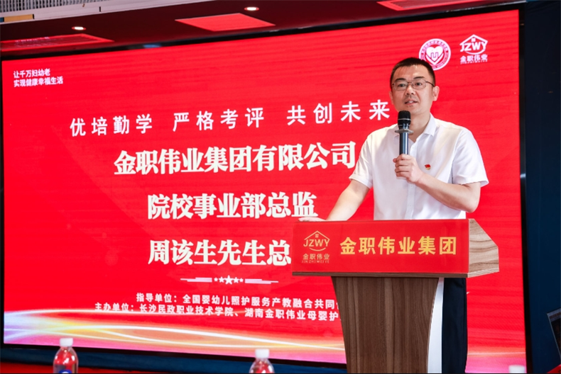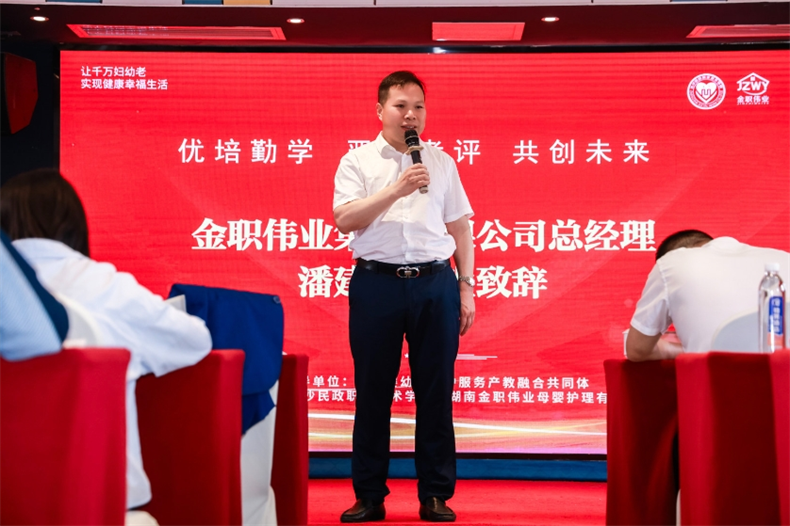 4月27日,2024年第二期1+X幼兒照護職業技能等級證書考評員到期復審換證培訓班結業典禮在長沙舉行,金職偉業總經理潘建明、院校事業部總監周該生出席典禮并發表講話。