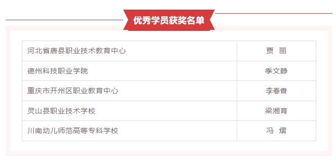 經過3天干貨滿滿的培訓,學員們收獲頗豐,河北省唐縣職業技術教育中心賈麗等5位老師獲評優秀學員,靈山縣職業技術學校伍芳玲等3位老師獲評優秀班干部。