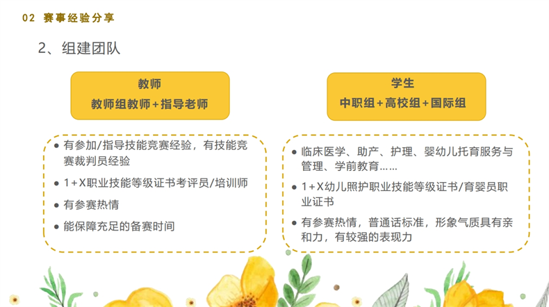 課上,丁揚老師介紹了2023一帶一路暨金磚國家技能發展與技術創新大賽首屆嬰幼兒照護職業技能賽項,并分別從選擇組別、組建團隊、研究賽事規則、解析比賽常見問題等方面作賽事經驗分享。