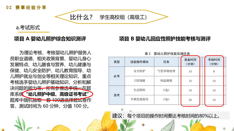 競賽項目包括:項目 A 嬰幼兒照護綜合知識測評,即理論考核;項目 B 嬰幼兒回應性照護技能考核與測評,即實操考核。