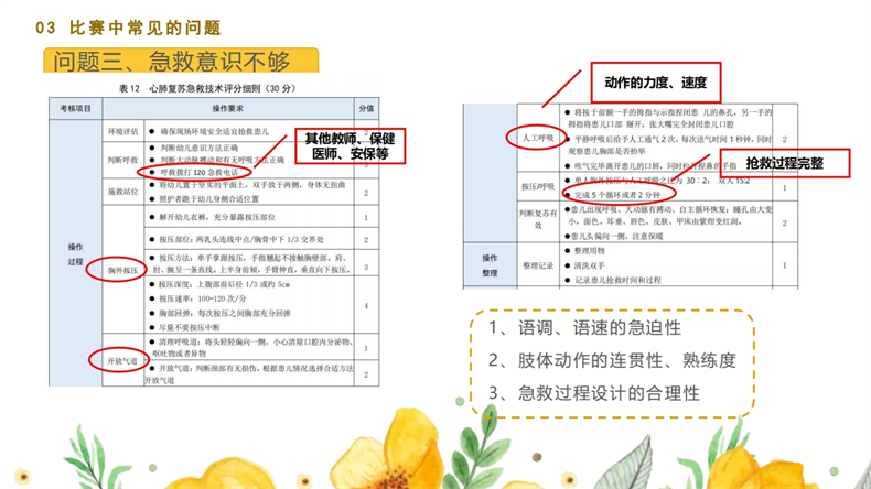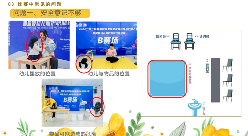 丁揚老師分別從安全意識、衛生意識、急救意識、人文關懷、專業度等方面具體分析了比賽過程中常見的問題及注意事項,提醒參賽選手要注意細節避免失分,拿到高分;她還建議想在嬰幼兒回應性照護技能考核與測評中拿高分的參賽選手,每個項目的操作時間要達到考核時間的80%以上。