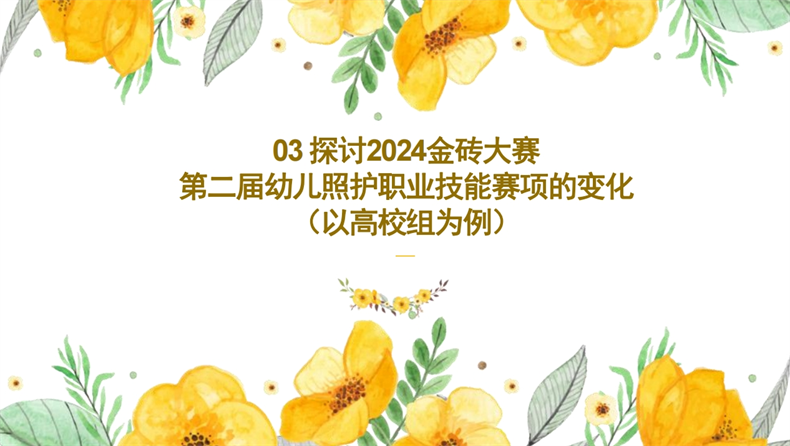 最后,丁揚老師以高校組為例,圍繞賽項名稱、參賽方式、考核內容,與大家探討了2024一帶一路暨金磚國家技能發展與技術創新大賽第二屆幼兒照護職業技能賽項的變化。