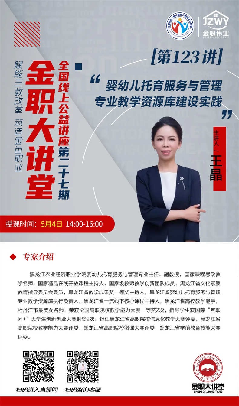 5月4日,金職大講堂將開啟第二十七期第123講,課程將邀請黑龍江農業經濟職業學院嬰幼兒托育服務與管理專業主任、副教授王晶,進行《嬰幼兒托育服務與管理專業教學資源庫建設實踐》主題授課,誠邀各位行業專家、院校老師共同參與。