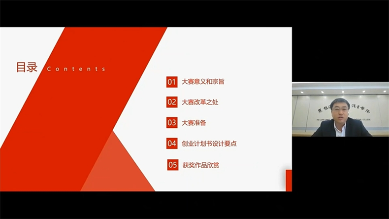 課上,姜輝老師從大賽意義和宗旨、大賽改革之處、大賽準備、創業計劃書設計要點、獲獎作品欣賞五方面展開課程講解。