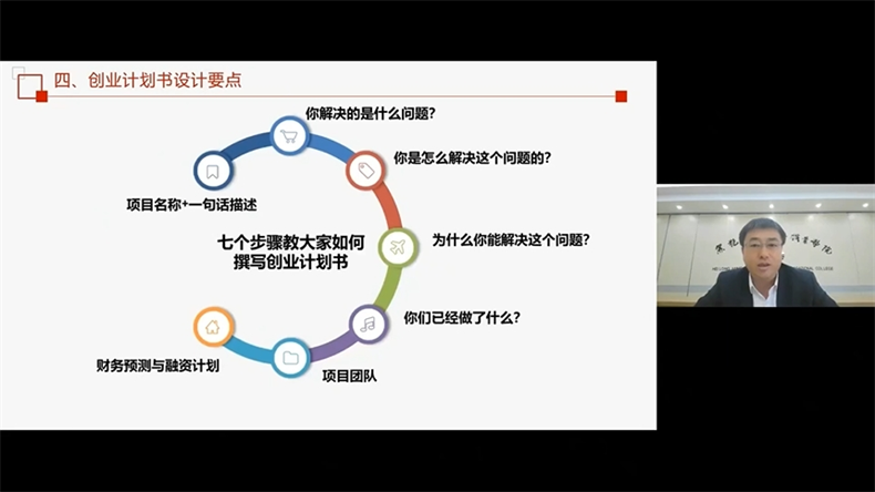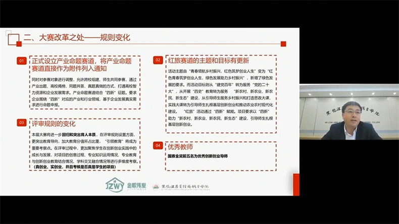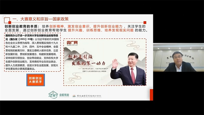 他從時間安排、項目內容設計,項目創新度、商業度及教育引領能力提升幾方面講解如何做好大賽準備。并以參賽過程中可能出現的問題為切入點,引導大家在團隊組織、項目籌備優化上找準定位與側重點。