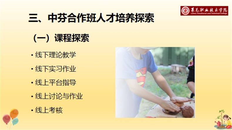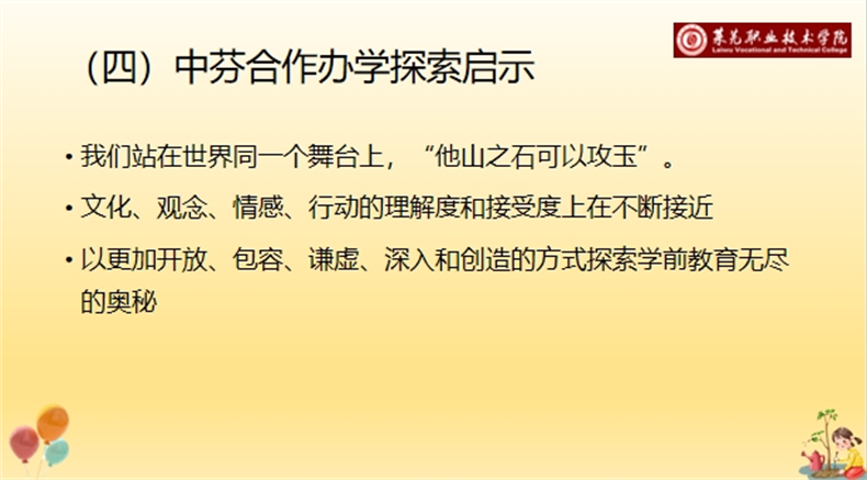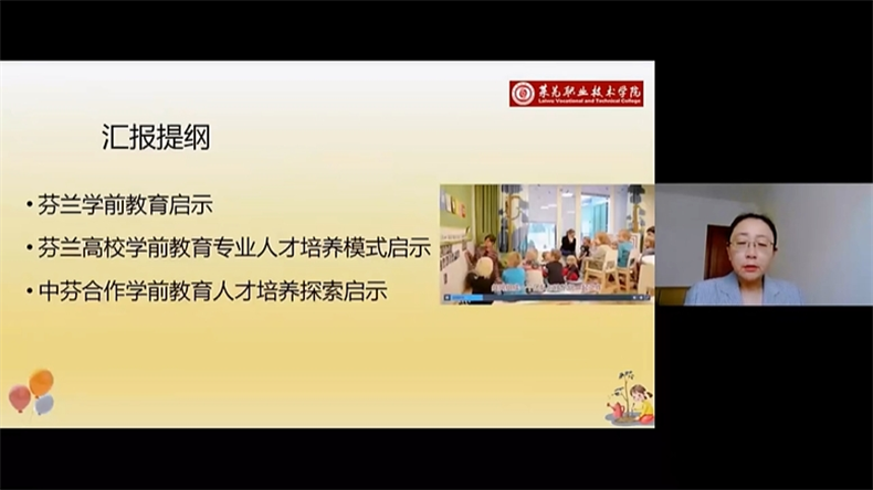 課上,周晶教授從芬蘭學(xué)前教育特點、政策支持與專業(yè)人才培養(yǎng)模式,萊蕪職業(yè)技術(shù)學(xué)院在中芬合作學(xué)前教育專業(yè)建設(shè)方面的實踐分享教育教學(xué)啟示。