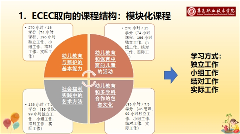 周晶教授以芬蘭應(yīng)用技術(shù)大學(xué)課程結(jié)構(gòu)、課程地圖、體驗性學(xué)習(xí)方式為切入點,解析芬蘭學(xué)前教育人才培養(yǎng)模式,并簡要介紹了中芬合作課程方案。她談到,萊蕪職業(yè)技術(shù)學(xué)院在中芬合作課程方案的制定上沿用了芬蘭學(xué)前教育專業(yè)人才培養(yǎng)三個核心課程模塊,并在特色價值觀的引導(dǎo)上,在教學(xué)方案的細(xì)化程度、可操作性、可指導(dǎo)性提升上不斷精進(jìn)。