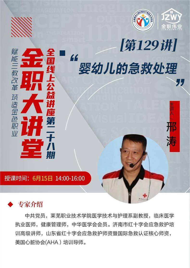 6月15日,金職大講堂將開啟第二十八期第129講,課程將邀請萊蕪職業(yè)技術(shù)學(xué)院刑濤教授,進(jìn)行《嬰幼兒的急救處理》主題授課。