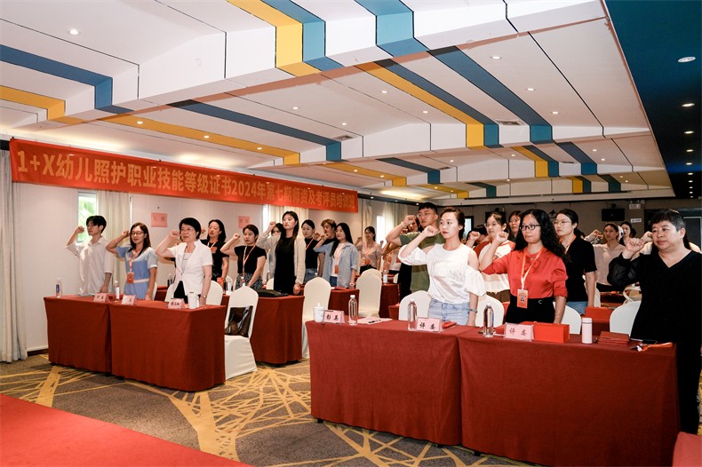 “今天,我鄭重宣誓,我將全身心工作,用心培養教育學生,盡心盡責,嚴格考評,恪守幼兒照護職業道德,對每個孩子用愛心去塑造、用真情去感化……”一聲聲鏗鏘有力的誓詞直擊心靈,彰顯了各位師資及考評員為幼兒照護事業的熱愛與立德樹人的決心。至此,1+X幼兒照護職業技能等級證書2024年第七期師資及考評員培訓圓滿落下帷幕。