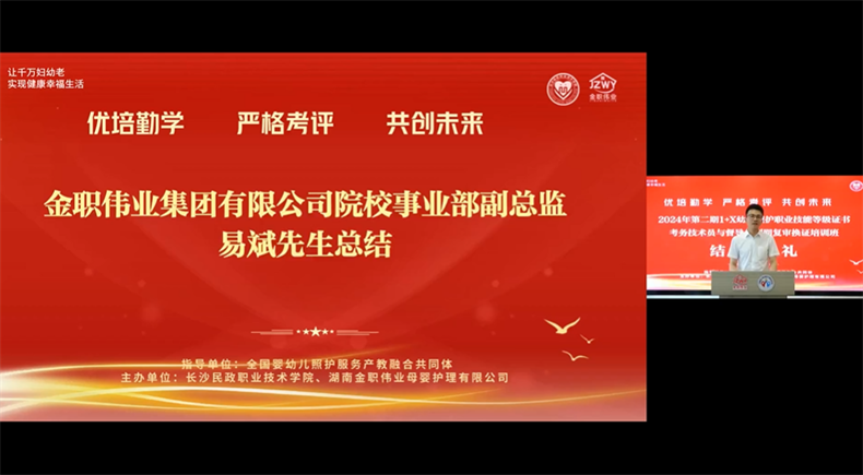 最后,金職偉業院校事業部副總監易斌對順利完成各項培訓任務并圓滿結業的參訓教師表示熱烈祝賀,“幼兒照護證書承載著嬰幼兒照護行業的高質量發展,產后恢復證書則承載著產后媽媽的健康,兩張證書的質量與我國的人口長期均衡發展息息相關,同樣也關系著民生福祉。希望各位老師帶著責任與擔當重新啟程,全力推動學校考評工作開展,賦能新時代技術技能人才培養。”