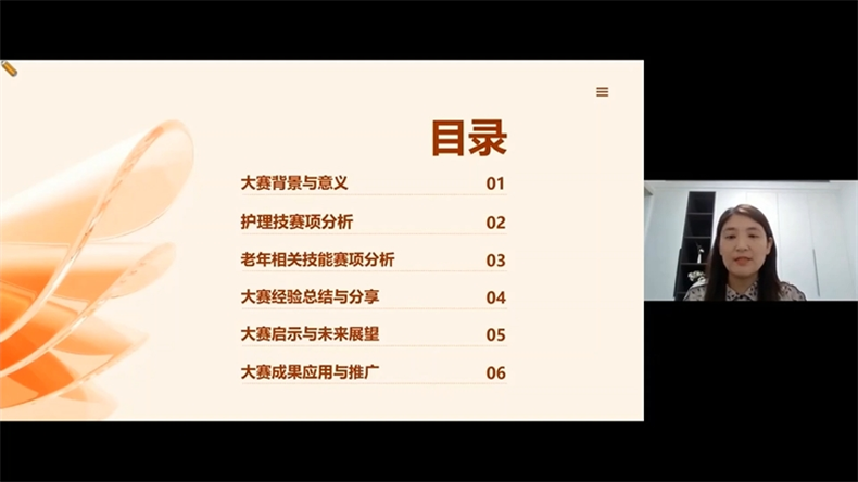 課上,劉琳琳老師從護理及老年保健相關賽項的背景、意義、目的、內容等方面展開課程講解,梳理備賽流程,總結備賽經驗,分享備賽策略。
