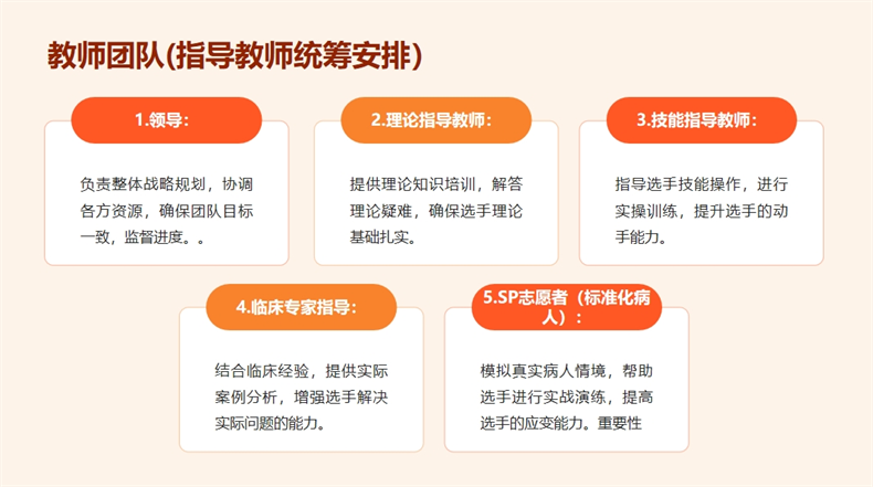 劉琳琳老師談到,由于比賽及備賽強度大、要求高,在選手選拔過程中優先選取身體素質好、意志堅定、紀律性強、有批判性思維的學生;她認為,教師團隊需要包含備賽領導人員、理論指導老師、技能指導教師、臨床專家、標準化病人幾個部分,由教師團隊統籌備賽整體流程,保證穩步、高效地推進備賽事項。