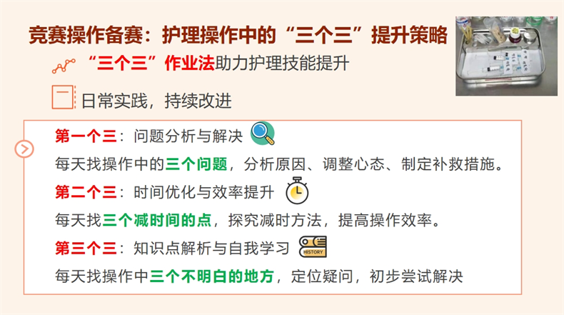 課上,劉琳琳老師詳細介紹了近幾年全國職業院校技能大賽護理技能賽項競賽形式、內容及考核重點的變化,并從中提煉出比賽考核的側重點。“近幾年競賽內容的變化,體現了競賽理論知識和實踐技能并重的考核理念;競賽重視考試效率、公正性、規范性和嚴謹性;競賽內容更加貼近臨床護理的實際需求;高度重視參賽選手的團隊協作能力、臨床思維與決策能力、知識應用能力、人文素養及溝通技巧的培養。”
