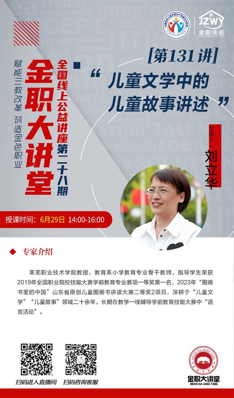 6月29日,金職大講堂將開啟第二十八期第131講,課程將邀請萊蕪職業技術學院劉立華教授,進行《兒童文學中的兒童故事講述》主題授課。