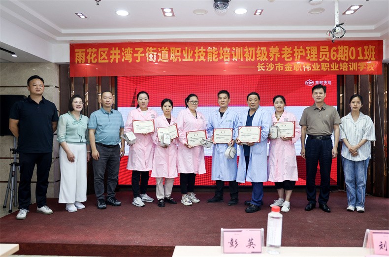 6月28日,由雨花區人社局主辦,長沙市金職偉業職業培訓學校與雨花區井灣子街道聯合開設的雨花區井灣子街道職業技能培訓初級養老護理員6期01班舉行結業典禮。同時,為進一步促進學員就業,拓寬就業渠道,典禮同期舉行了就業見面會。長沙市人力資源和社會保障局職業能力建設處、雨花區人社局就業服務中心相關負責人,金職偉業集團有限公司董事長彭英,長沙市金職偉業職業培訓學校相關負責人出席典禮。