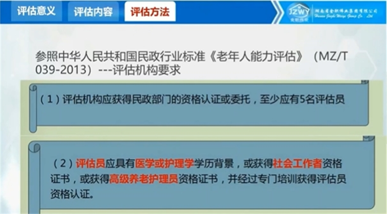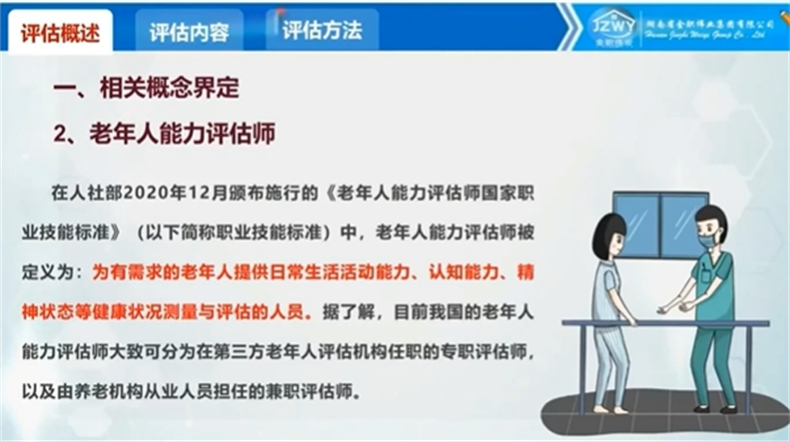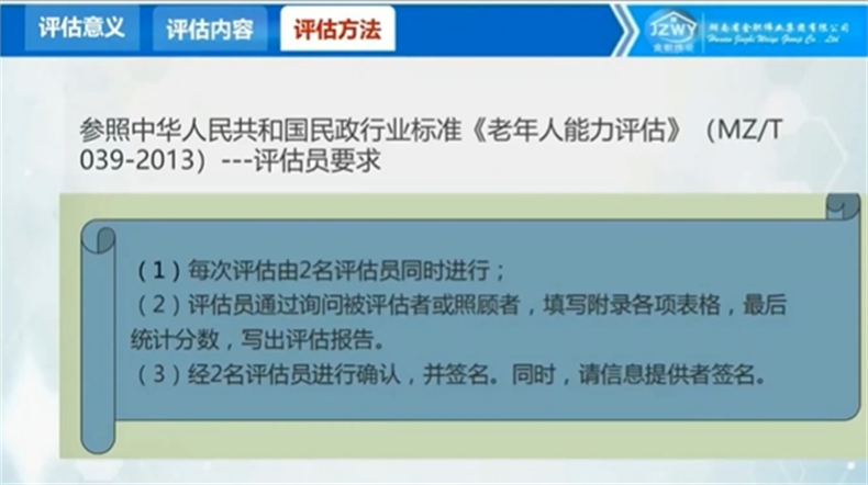 課程最后,吳燕老師從評估機構與評估員兩個維度來講解對應的評估方法。她談到,按照相關規定,評估機構應獲得民政部門的資格認證或委托,至少有5名評估員;機構內評估員應具有醫學或護理學學歷背景,或獲得社會工作者資格證書,或獲得高級養老護理員資格證書,并經過專門培訓獲得評估員資格認證;機構內評估區域環境應保持清潔、安靜、寬敞、光線明亮空氣清新、溫度適宜,至少有三把椅子和一張診桌4-5個臺階,以供評估使用。