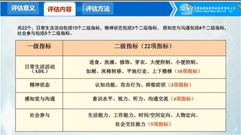 老年人能力評估內容包括日常生活活動、精神狀態、感知覺與溝通、社會參與4項一級指標及22項二級指標。隨后,吳燕老師就4項一級指標的概念、評估內容、評估標準及評估注意事項逐一講解。她談到,在對老年人進行能力評估時,可以根據評估分值進行能力劃分,也可以采用老年人能力評估結果判定卡。在使用結果判定卡時,一般根據日常生活活動進行初步定位,鎖定目標區域,然后根據其它三項能力在結果判定卡上定位查找相應的能力等級。