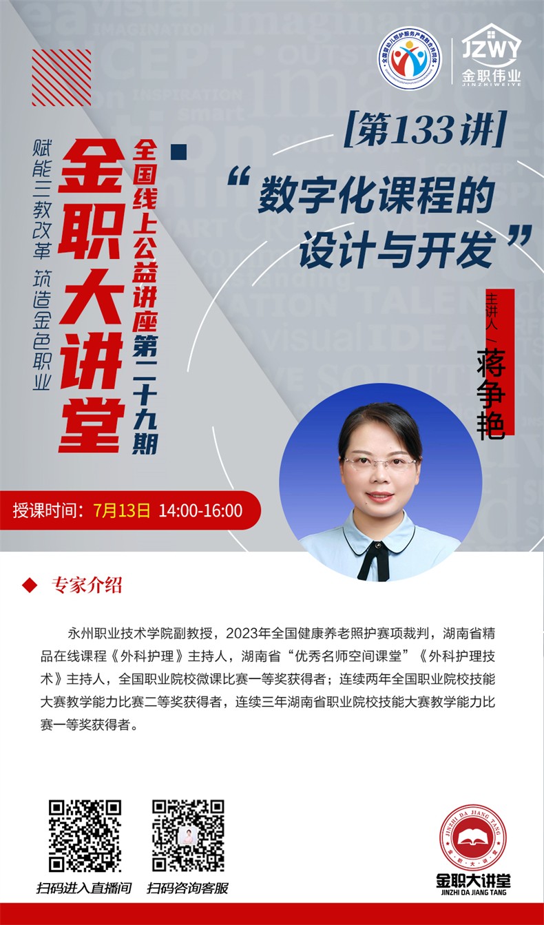 7月13日,金職大講堂將開啟第二十九期第133講,課程將邀請永州職業技術學院蔣爭艷教授,進行《數字化課程的設計與開發》主題授課。