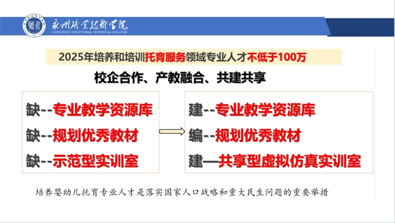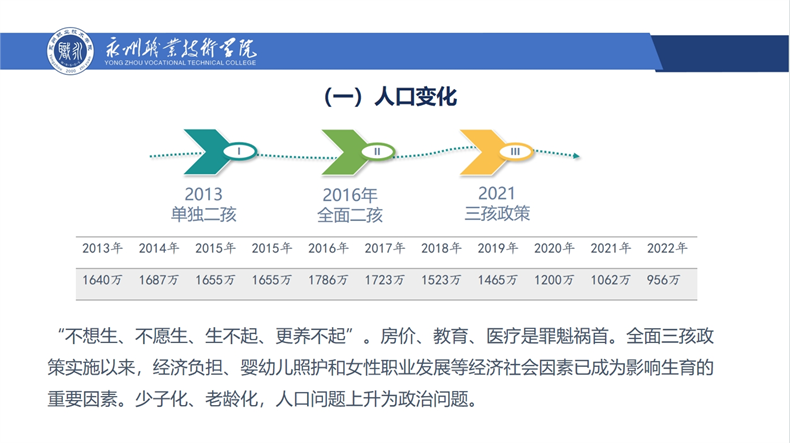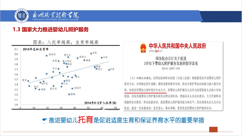 唐玲芳對政策背景進行了詳細分析,以增強大家對嬰幼兒托育專業發展的信心。從人口數據變化來看,我國正出現少子化、老齡化趨勢。推進嬰幼兒托育是促進適度生育和保證養育水平的重要舉措,國家正大力推進嬰幼兒照護服務發展,要求加強嬰幼兒照護服務隊伍建設。