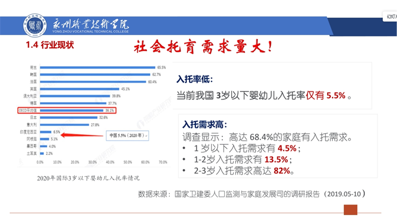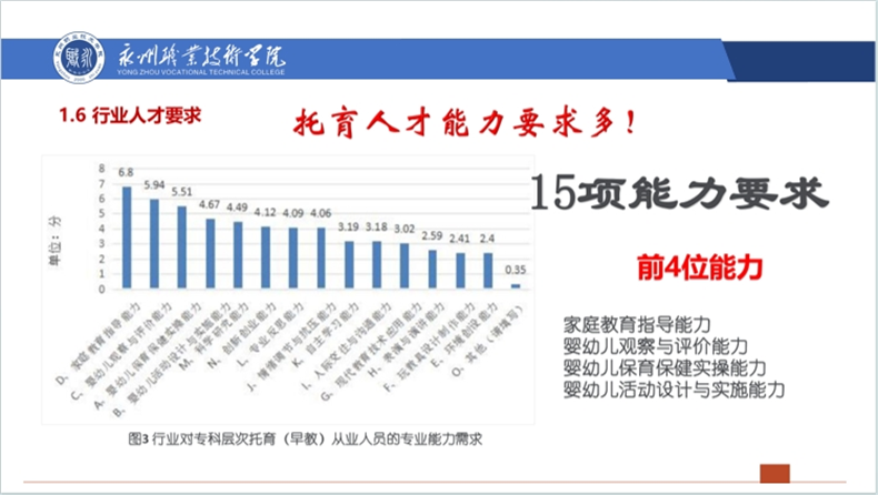 根據國家衛健委人口監測與家庭發展司的調研報告,我國存在嬰幼兒托育行業供需不平衡的狀況:有入托需求的家庭占比很高,社會托育需求量大,但嬰幼兒入托率仍很低。因此,培育大量嬰幼兒托育人才是時代所需。0-3歲嬰幼兒時期是人類個體一生中習得知識最多的階段,這就表示,嬰幼兒照護對于照護者的教育水平、業務能力有著高要求,其中前四位的能力為家庭教育指導能力、嬰幼兒觀察與評價能力、嬰幼兒保育保健實操能力、嬰幼兒活動設計與實施能力。