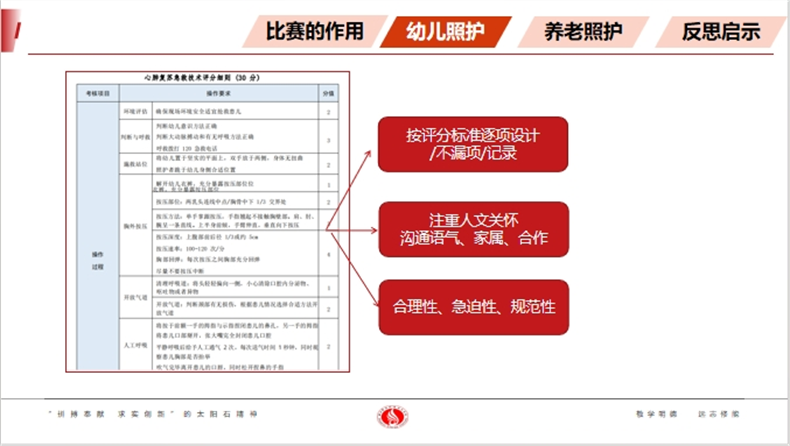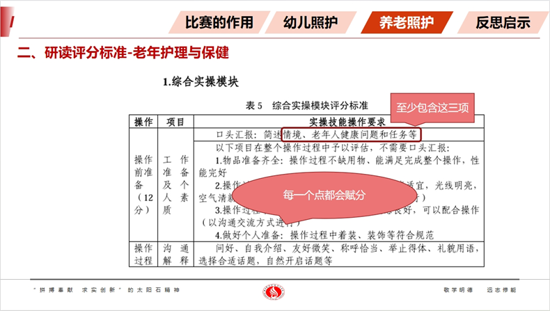 課上,馬雪雪從本校的職業(yè)技能大賽參賽經(jīng)驗(yàn)出發(fā),為大家做了幼兒照護(hù)、養(yǎng)老照護(hù)兩個(gè)賽道相關(guān)的技能大賽備賽指導(dǎo)。