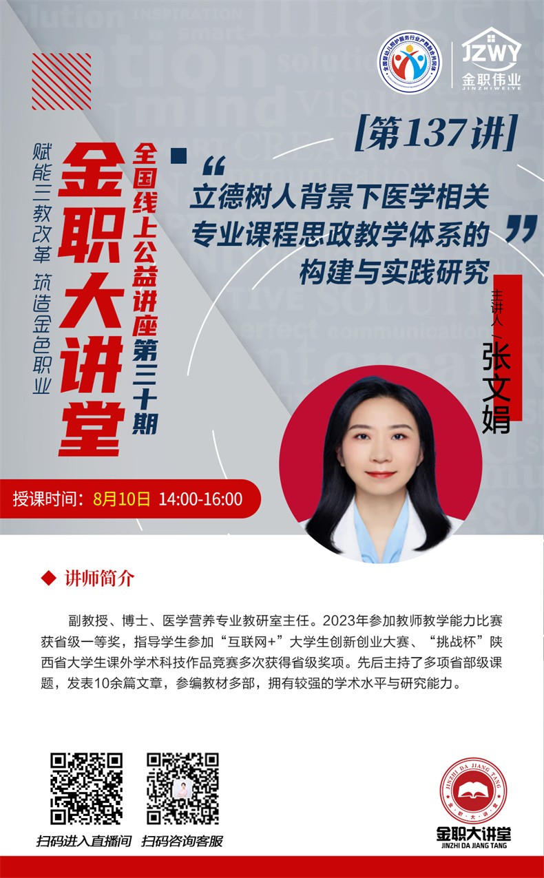 8月10日,金職大講堂將開啟第三十期第137講,課程將邀請(qǐng)陜西能源職業(yè)技術(shù)學(xué)院張文娟副教授,進(jìn)行《立德樹人背景下醫(yī)學(xué)相關(guān)專業(yè)課程思政教學(xué)體系的構(gòu)建與實(shí)踐研究》主題授課。