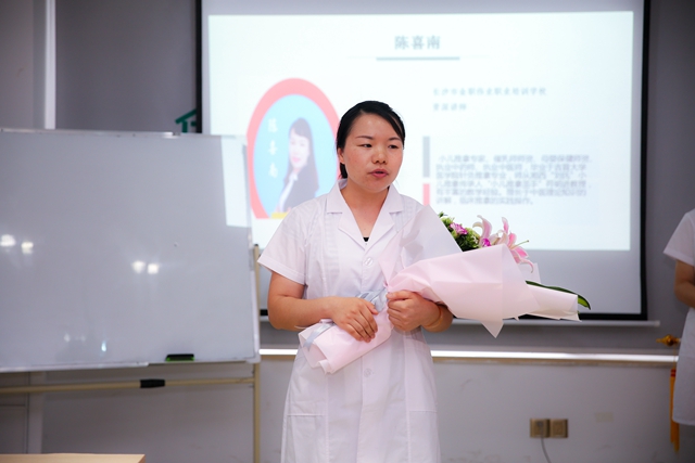 隨后,負(fù)責(zé)本期小兒推拿班授課的陳喜南、謝俐君兩位老師分別致辭。致辭完畢,學(xué)員們送上了精美的鮮花和感恩錦旗。“授教固有方,桃李滿天下”、“遍栽桃李樹,廣育棟梁才”,對兩位老師而言,無疑是最欣慰的時刻。