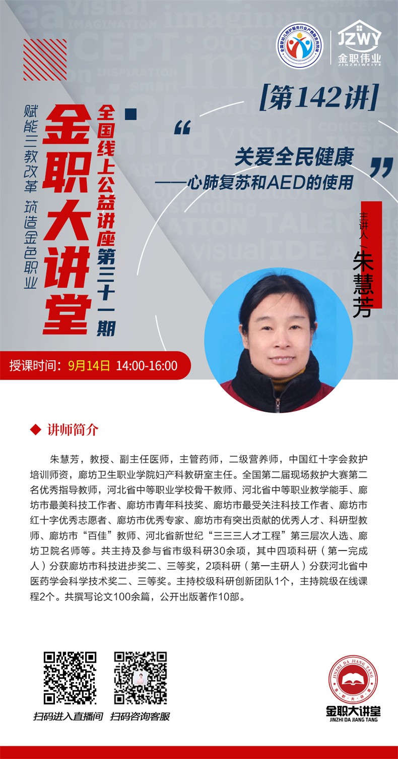 9月14日,金職大講堂將開啟第三十一期第142講,課程將邀請廊坊衛生職業學院朱慧芳教授,進行《關愛全民健康——心肺復蘇和AED的使用》主題授課。