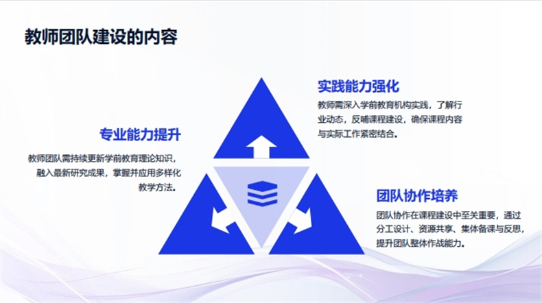 價(jià)值引領(lǐng)、數(shù)字賦能是一流核心課程建設(shè)的兩大引擎。針對(duì)當(dāng)前學(xué)前教育專(zhuān)業(yè)課程思政存在的問(wèn)題,如思政元素理解泛化、融入方式生硬等,她提出了“三融三促”的課程思政模式,即將專(zhuān)業(yè)知識(shí)與思政案例、實(shí)習(xí)實(shí)訓(xùn)與思政主題、第二課堂與思政文化相融合,以此促進(jìn)學(xué)生學(xué)思結(jié)合、修為養(yǎng)成和文化傳承。她還以《學(xué)前教育學(xué)》為例,分享了如何設(shè)計(jì)教學(xué)內(nèi)容,培養(yǎng)具有教育家精神、數(shù)字素養(yǎng)和家國(guó)情懷的新質(zhì)幼兒教師。