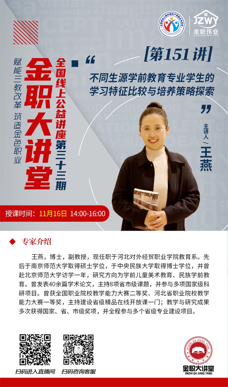 11月16日,金職大講堂將開(kāi)啟第三十三期第151講,課程將邀請(qǐng)河北對(duì)外經(jīng)貿(mào)職業(yè)學(xué)院王燕副教授,進(jìn)行《不同生源學(xué)前教育專(zhuān)業(yè)學(xué)生的學(xué)習(xí)特征比較與培養(yǎng)策略探索》主題授課。