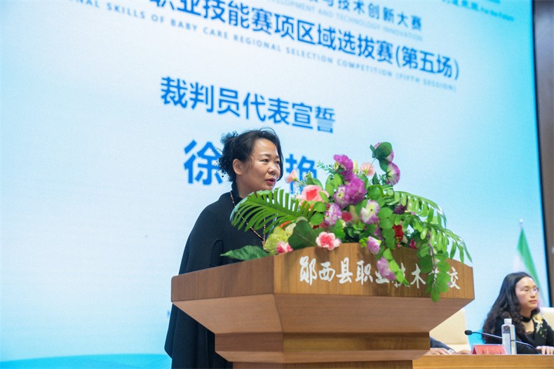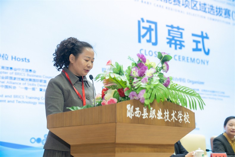 經(jīng)過三天的激烈角逐,大賽圓滿閉幕,大賽裁判長、河南鄭州幼兒師范高等專科學(xué)校教授徐春艷,大賽仲裁長、四川省達(dá)州職業(yè)技術(shù)學(xué)院教授蒲梅,鄖西縣職業(yè)技術(shù)學(xué)校校長殷均忠、黨委副書記余秀銳、工會(huì)主席陶富彬、黨委委員董作青,金職偉業(yè)集團(tuán)有限公司院校事業(yè)部經(jīng)理王進(jìn)等出席閉幕式。